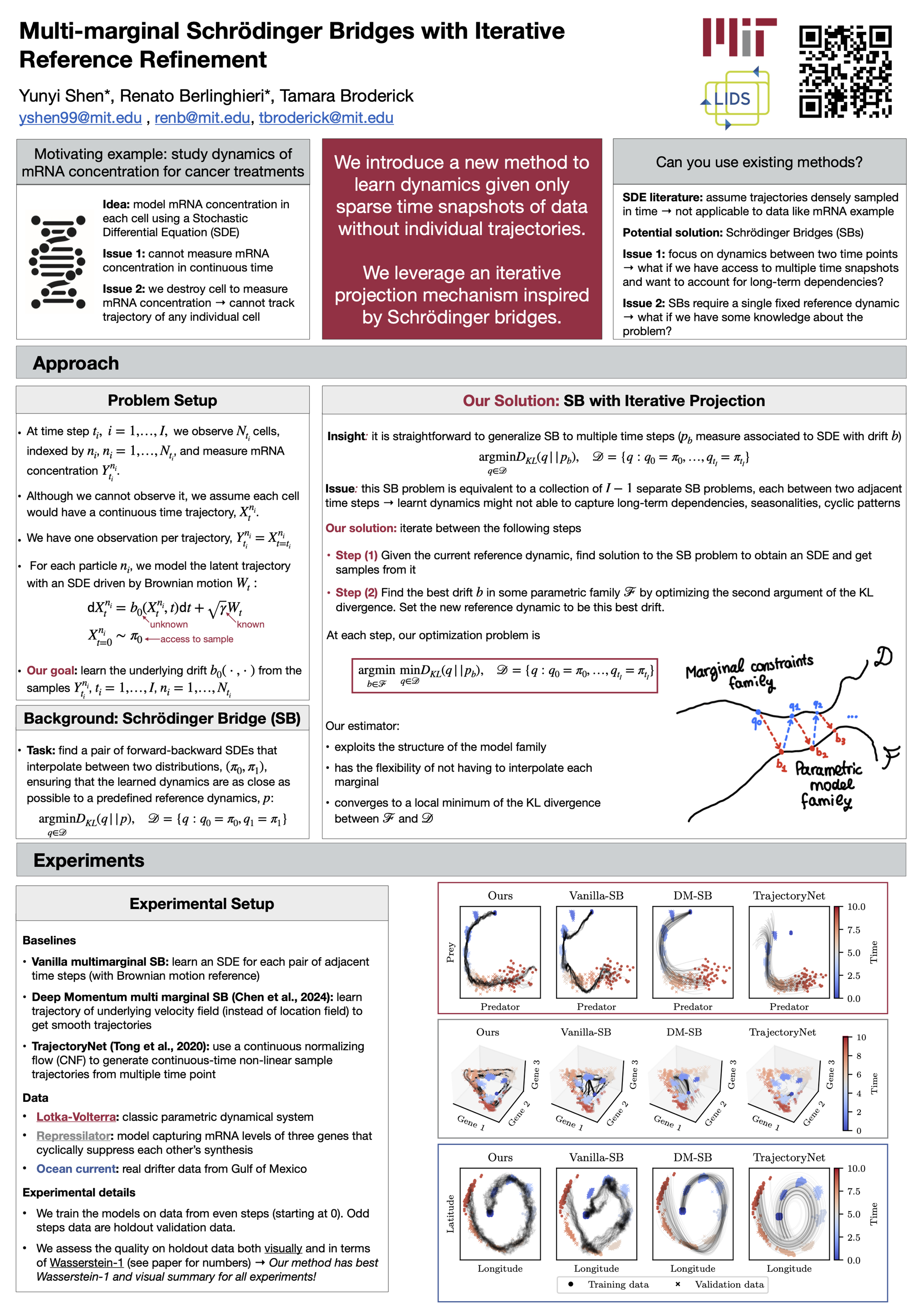 Practitioners often aim to infer an unobserved population trajectory using sample snapshots at multiple time points. E.g. given single-cell sequencing data, scientists would like to learn how gene expression changes over a cell’s life cycle. But sequencing any cell destroys that cell. So we can access data for any particular cell only at a single time point, but we have data across many cells. The deep learning community has recently explored using Schrödinger bridges (SBs) and their extensions in similar settings. However, existing methods either (1) interpolate between just two time points or (2) require a single fixed reference dynamic (often set to Brownian motion within SB). But learning piecewise from adjacent time points can fail to capture long-term dependencies. And practitioners are typically able to specify a model class for the reference dynamic but not the exact values of the parameters within it. So we propose a new method that (1) learns the unobserved trajectories from sample snapshots across multiple time points and (2) requires specification only of a class of reference dynamics, not a single fixed one. We demonstrate the advantages of our method on simulated and real data.