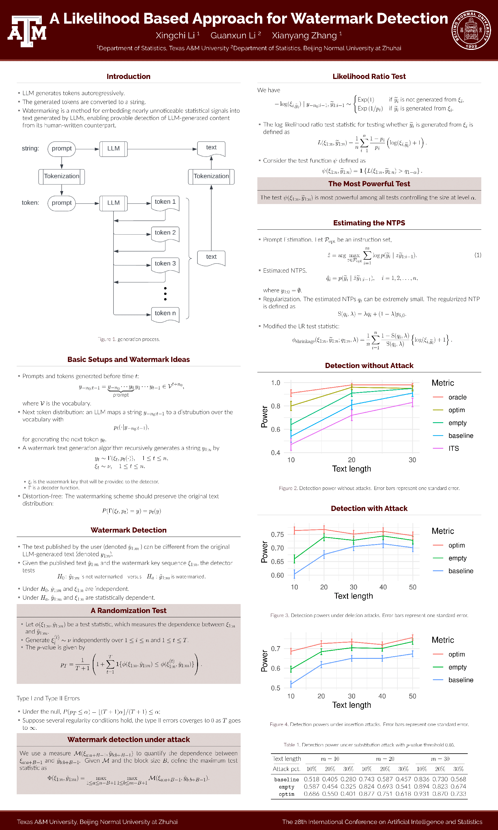 Watermarking techniques embed statistical signals within content generated by large language models to help trace its source. Although existing methods perform well on long texts, their effectiveness significantly decreases for shorter texts. We introduce a statistical detection approach that improves the power of watermark detection, particularly in shorter texts. Our method leverages both the watermark key sequence and the next token probabilities (NTPs) to determine whether a text is generated by a large language model. We demonstrate the optimality of our approach and analyze its power properties. We also investigate an approach to estimating NTPs and extend our method to scenarios where texts face potential attacks such as substitutions, insertions, or deletions. We validate the effectiveness of our technique using texts generated by Meta-Llama-3-8B from Meta and Mistral-7B-v0.1 from Mistral AI, utilizing prompts extracted from Google's C4 dataset. In scenarios without attacks and with short text lengths, our method demonstrates approximately 65% power improvement compared to the baseline method on average. We release all code publicly at https://github.com/doccstat/llm-watermark-adaptive.