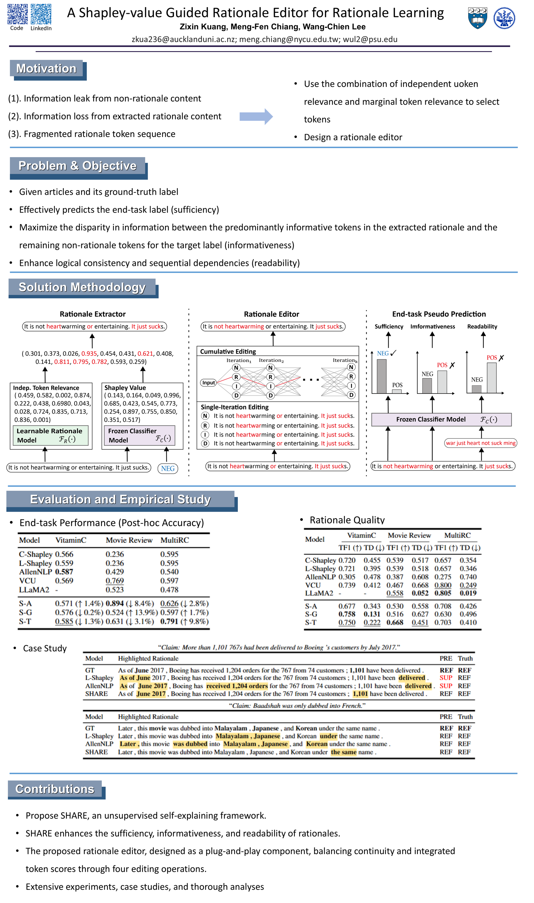 Rationale learning aims to automatically uncover the underlying explanations for NLP predictions. Previous studies in rationale learning mainly focus on the relevance of independent tokens with the predictions without considering their marginal contribution and the collective readability of extracted rationales. Through an empirical analysis, we argue that the sufficiency, informativeness, and readability of rationales are essential for explaining diverse end-task predictions. Accordingly, we propose Shapley-value Guided Rationale Editor (SHARE), an unsupervised approach that refines editable rationales while predicting task outcomes. SHARE extracts a sequence of tokens as a rationale, providing a collective explanation that is sufficient, informative, and readable. SHARE is highly adaptable for tasks like sentiment analysis, claim verification, and question answering, and can integrate seamlessly with various language models to provide explainability. Extensive experiments demonstrate its effectiveness in balancing sufficiency, informativeness, and readability across diverse applications. Our code and datasets are available at https://github.com/zixinK/SHARE.