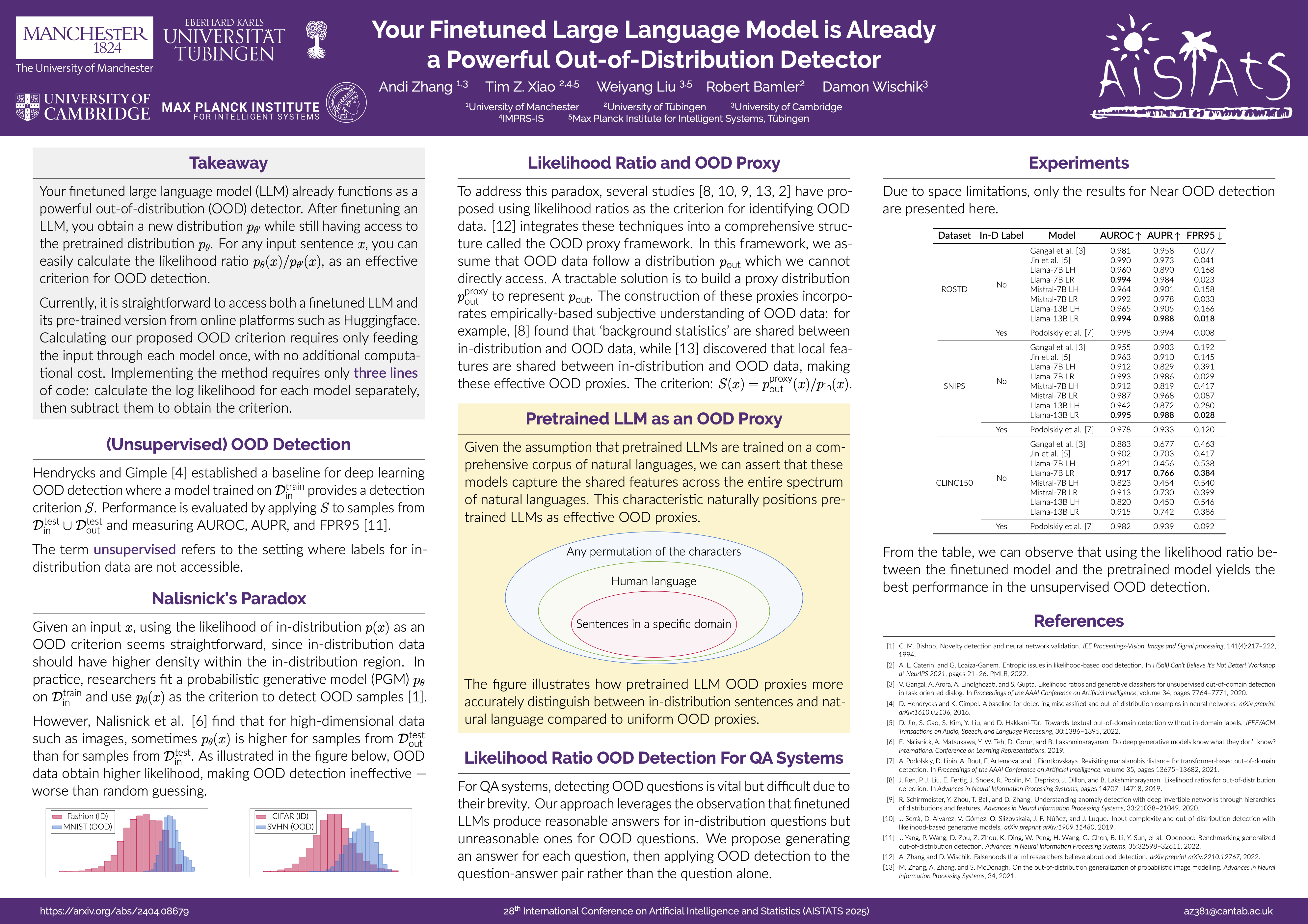 We revisit the likelihood ratio between a pretrained large language model (LLM) and its finetuned variant as a criterion for out-of-distribution (OOD) detection. The intuition behind such a criterion is that, the pretrained LLM has the prior knowledge about OOD data due to its large amount of training data, and once finetuned with the in-distribution data, the LLM has sufficient knowledge to distinguish their difference. Leveraging the power of LLMs, we show that, the likelihood ratio can serve as an effective OOD detection criterion. Moreover, we apply the proposed LLM-based likelihood ratio to detect OOD questions in question-answering (QA) systems, which can be used to improve the performance of specialized LLMs for general questions. Given that likelihood can be easily obtained by the loss functions within contemporary neural network frameworks, it is straightforward to implement this approach in practice with three lines of code. Since both the pretrained LLMs and its various finetuned models are widely available from online platforms such as Hugging Face, our proposed criterion can be effortlessly incorporated for OOD detection without the need for further training. We conduct comprehensive evaluation across on multiple settings, including far OOD, near OOD, spam detection, and QA scenarios, to demonstrate the effectiveness of the method. Code can be found at https://github.com/andiac/LLMOODratio