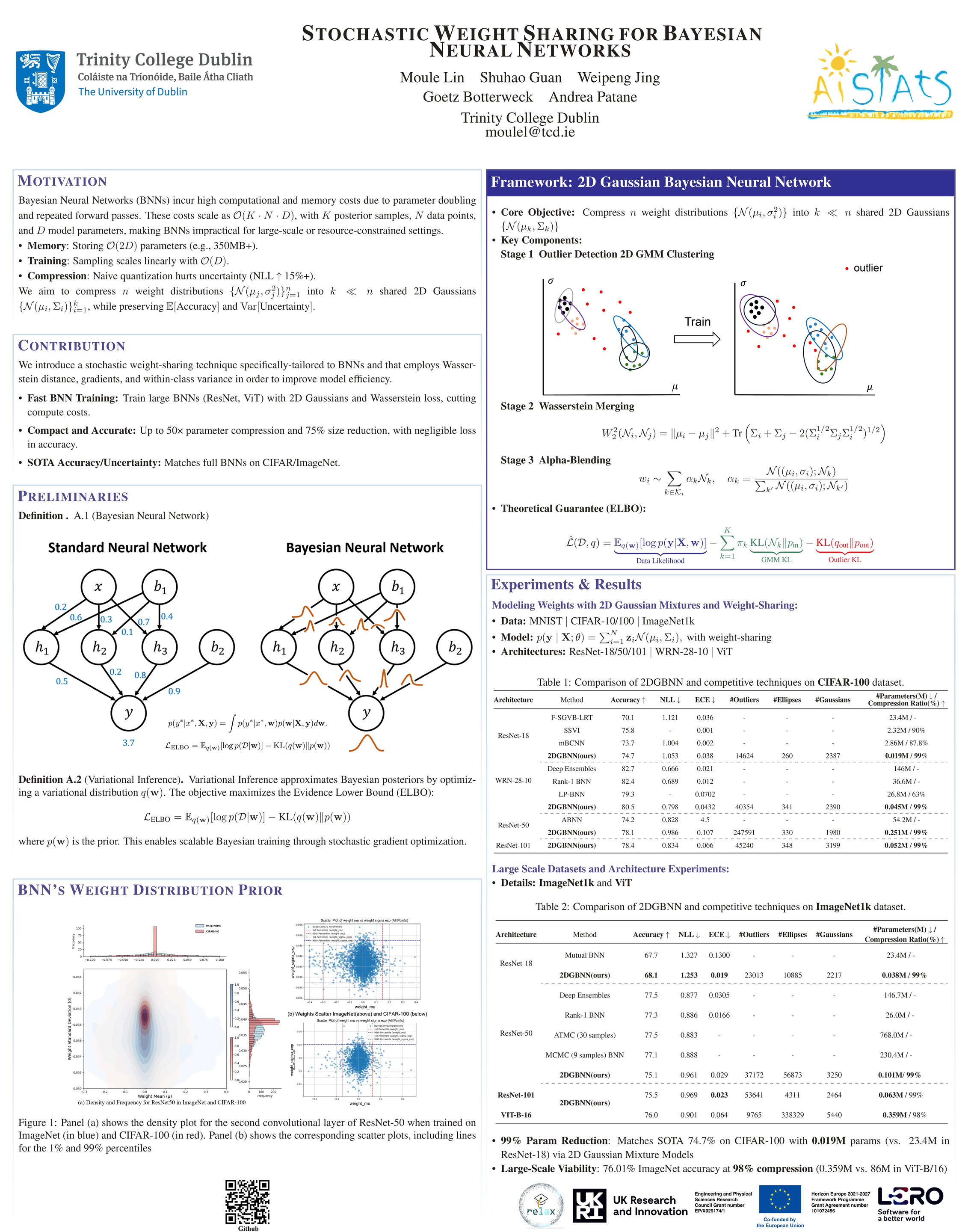 While offering a principled framework for uncertainty quantification in deep learning, the employment of Bayesian Neural Networks (BNNs) is still constrained by their increased computational requirements and the convergence difficulties when training very deep, state-of-the-art architectures. In this work, We reinterpret weight-sharing quantization techniques from a stochastic perspective in the context of training and inference with Bayesian Neural Networks (BNNs). Specifically, we leverage 2D-adaptive Gaussian distributions, Wasserstein distance estimations, and alpha-blending to encode the stochastic behavior of a BNN in a lower-dimensional, soft Gaussian representation. Through extensive empirical investigation, we demonstrate that our approach significantly reduces the computational overhead inherent in Bayesian learning by several orders of magnitude, enabling efficient Bayesian training of large-scale models, such as ResNet-101 and Vision Transformer (VIT). On various computer vision benchmarks—including CIFAR-10, CIFAR-100, and ImageNet1k—our approach compresses model parameters by approximately 50× and reduces model size by 75% while achieving accuracy and uncertainty estimations comparable to state-of-the-art.